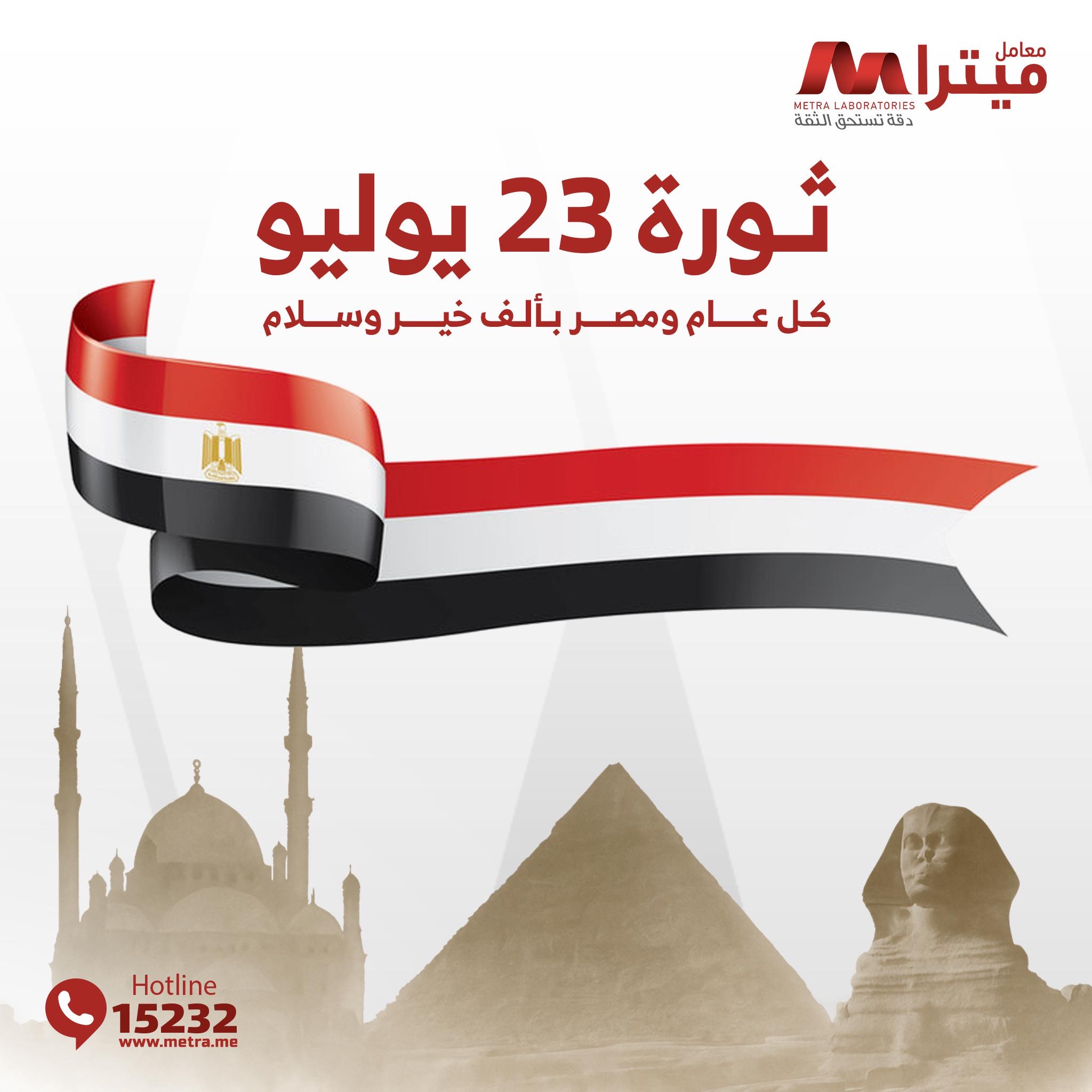 معامل ميترا للتحاليل الطبية يهنئون الشعب المصري بذكرى ثورة يوليو المجيدة كل عام ومصر بألف خير وسلام. 🇪🇬