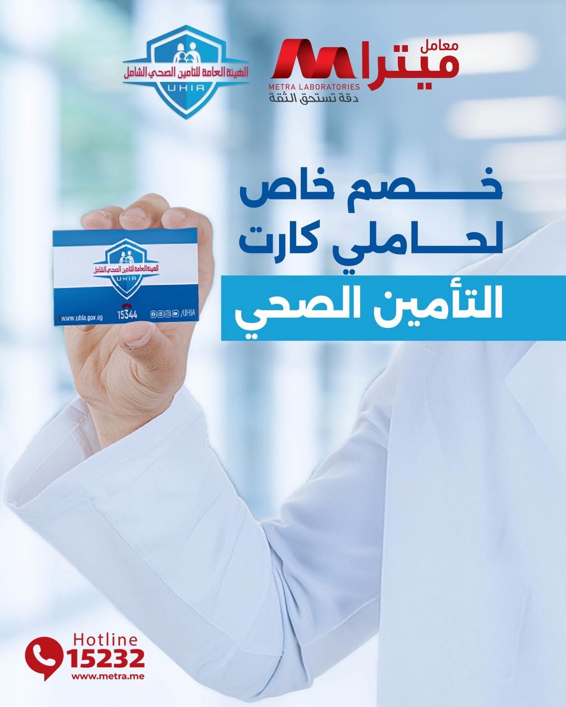 في معامل ميترا، صحتك أولويتنا… وعشان كده وفرنالك خصم خاص على جميع التحاليل الطبية عند إحضارك كارت التأمين الصحي.