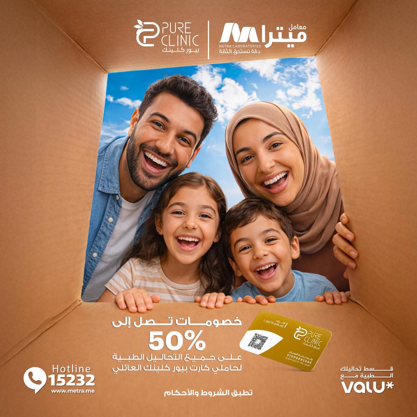 🎁 لحاملي كارت بيور كلينك العائلي استمتعوا بـ ٣ عروض خاصة جدًا على التحاليل الطبية داخل معامل ميترا وخصومات تصل إلى 50%.