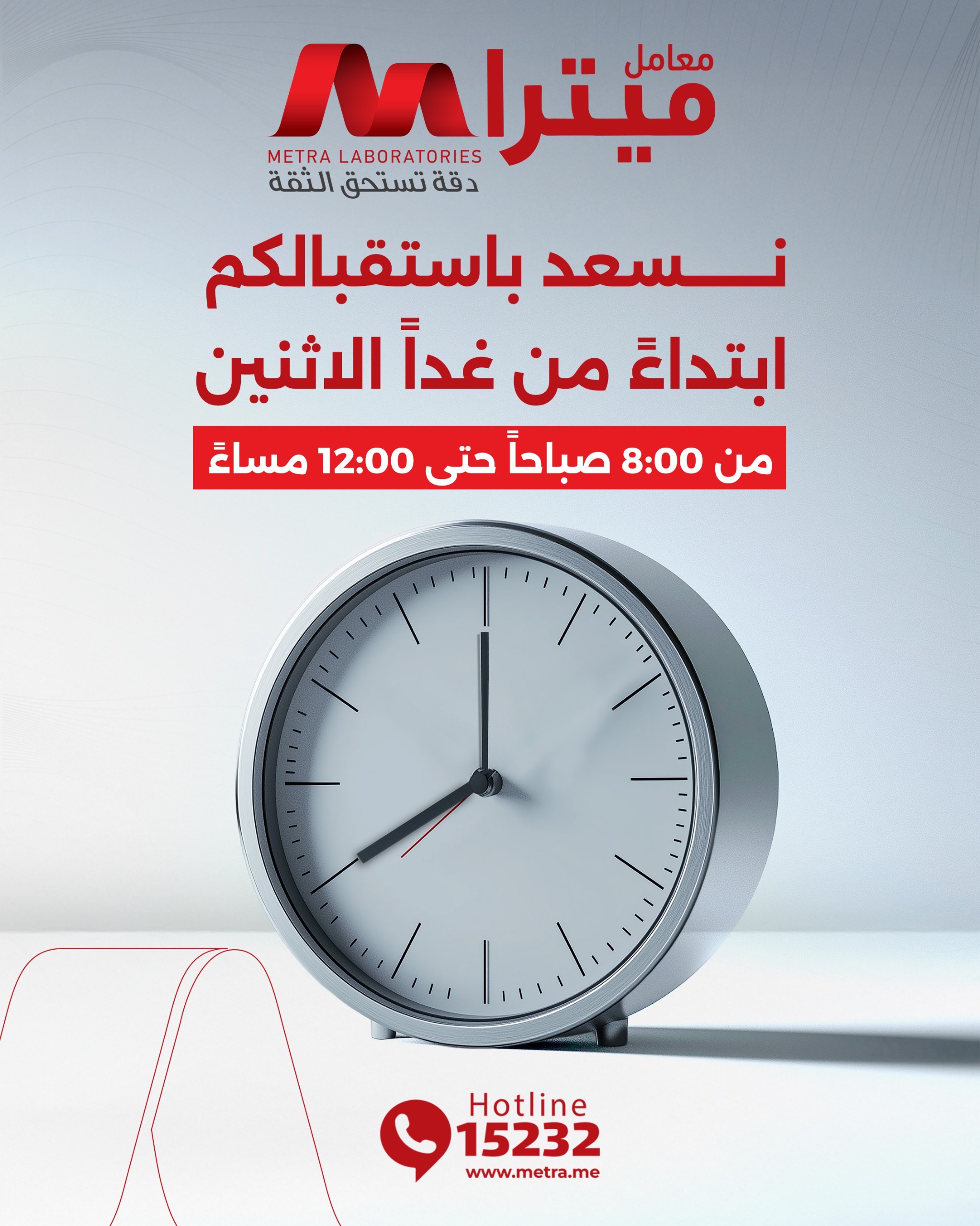 ⏰ من الساعة 8:00 صباحاً حتى الساعة 12:00 مساءً بجميع فروع معامل ميترا للتحاليل الطبية.